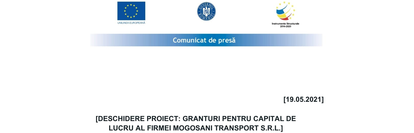 SC MOGOSANI TRANSPORT SRL anunță lansarea proiectul cu titlul ” GRANTURI PENTRU CAPITAL DE LUCRU AL FIRMEI MOGOSANI TRANSPORT S.R.L.” proiect nr RUE 9522 înscris în cadrul Măsurii ”Granturi pentru capital de lucru”, instituită prin OUG nr 130/2020.