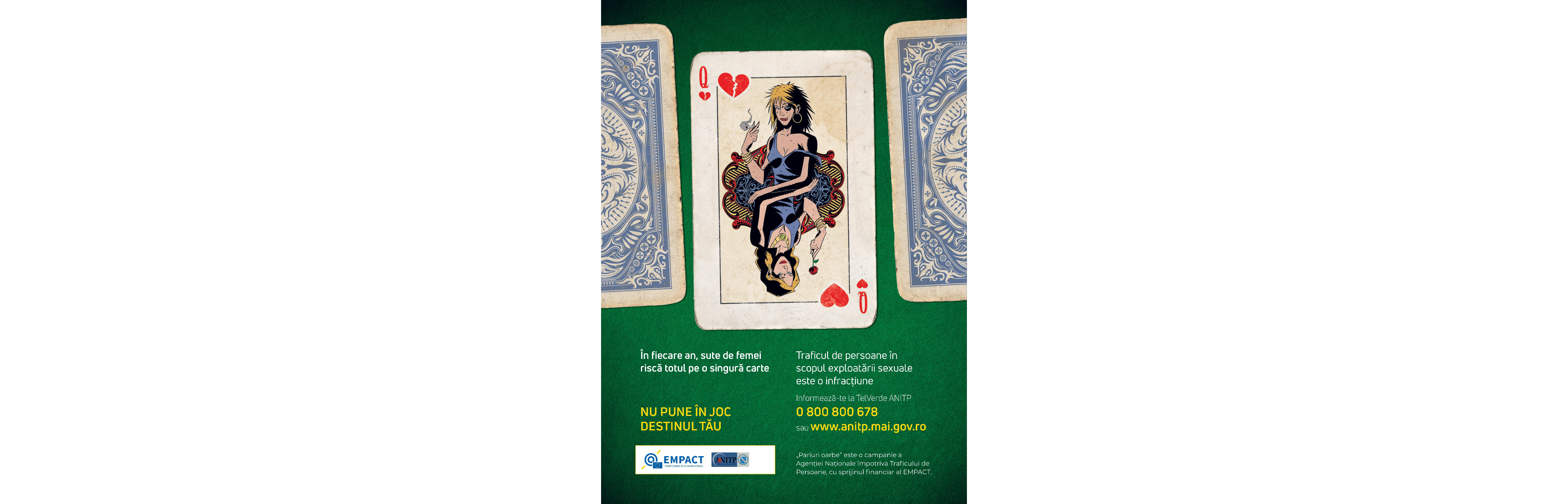 Mesajul campaniei, „În fiecare an, sute de femei riscă totul pe o singură carte”, ilustrează ușurința cu care oricine poate cădea în capcana traficanților și poate deveni o victimă a traficului de persoane.