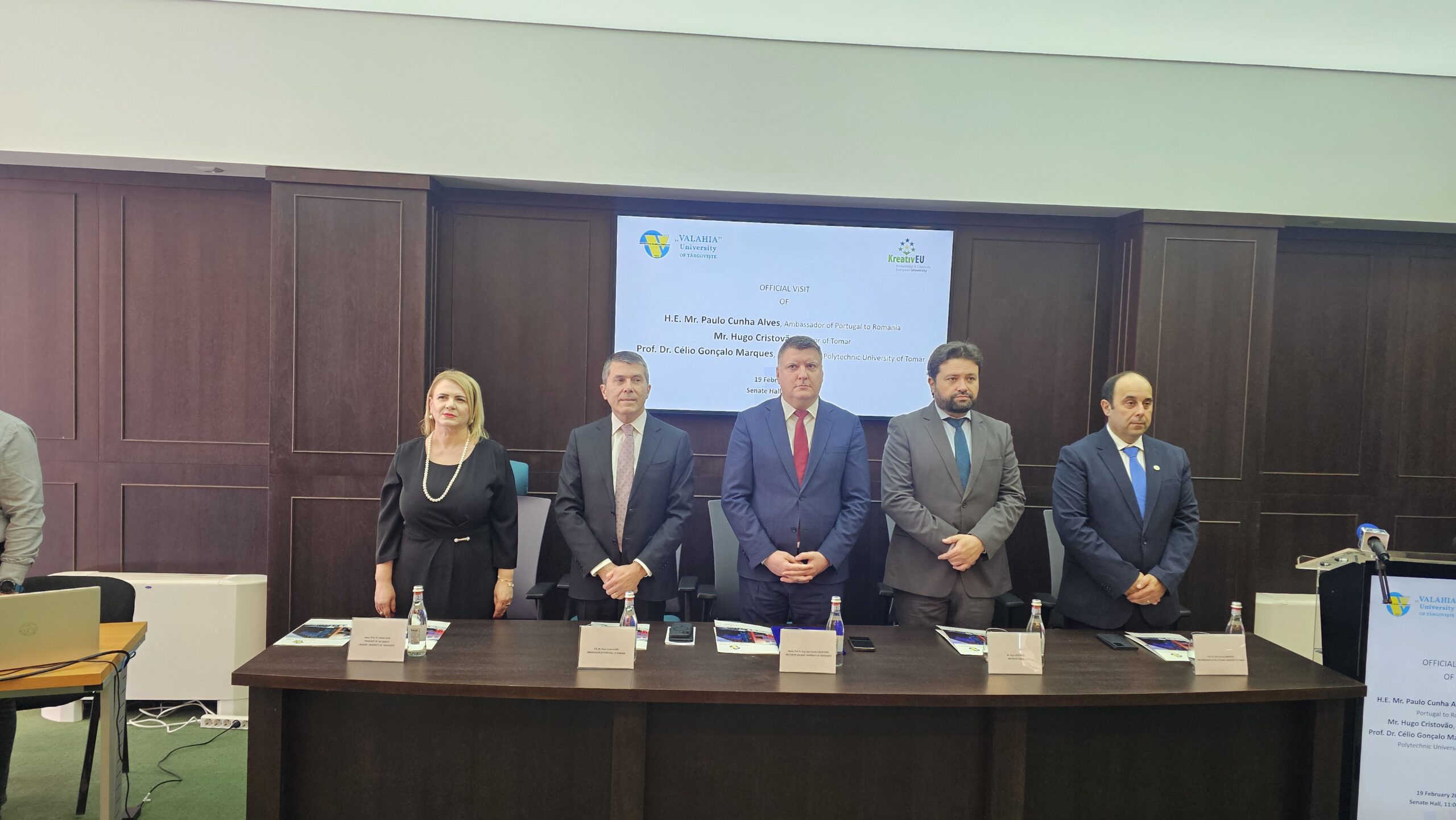 Excelența Sa, Paulo Cunha ALVES, Ambasadorul Portugaliei în România, a evidențiat ideea că instituțiile de învățământ superior din întreaga Europă constituie un teren fertil pentru schimburile academice bazate pe interculturalitate, ceea ce le oferă studenților, „viitori lideri ai Europei”, o perspectivă mai amplă asupra lumii și a identității comune. Totodată, Excelența Sa a adresat felicitări Rectorului Universității „Valahia” din Târgoviște, Prorectorului Universității Politehnice din Tomar, liderilor proiectului KreativEU, și reprezentanților orașului Târgoviște, pentru concretizarea înfrățirii dintre Municipiul Târgoviște și orașul Tomar. Acest lucru intensifică interacțiunile dintre locuitorii celor două orașe, și implicit, consolidarea legăturilor dintre Portugalia și România.